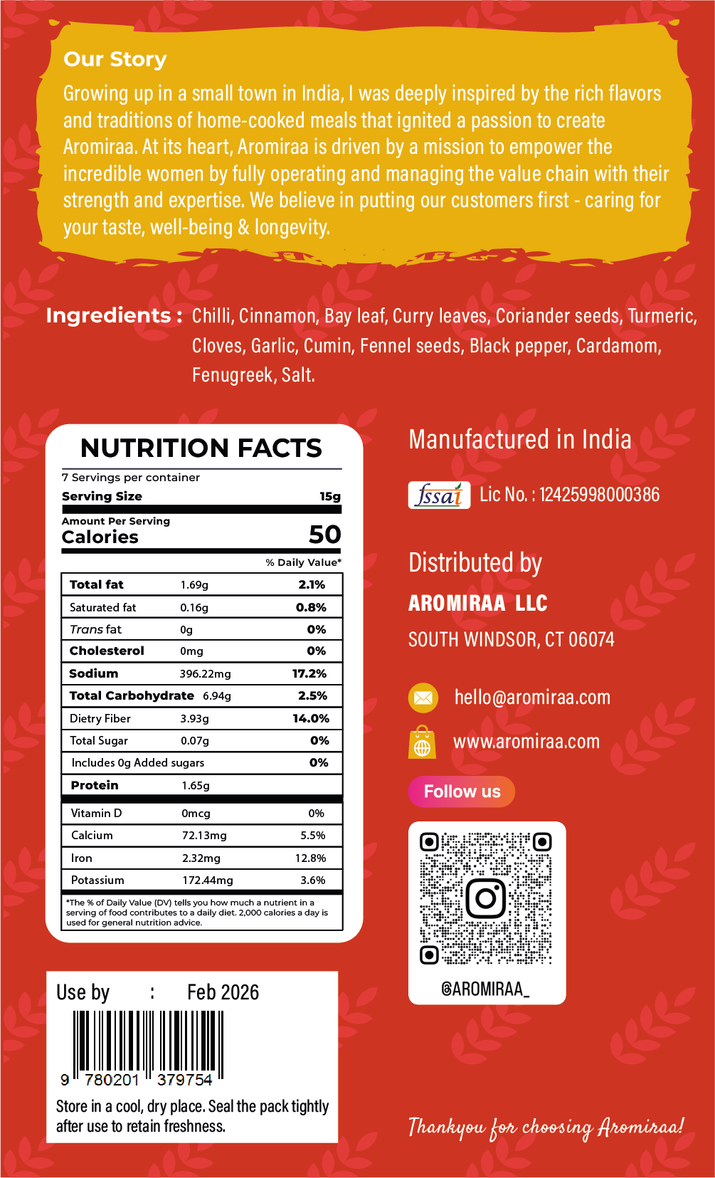 A versatile blend of spices crafted to enhance any curry dish – be it vegetarian or non-vegetarian. Adds rich flavor, aroma, and a touch of warmth to your everyday cooking.