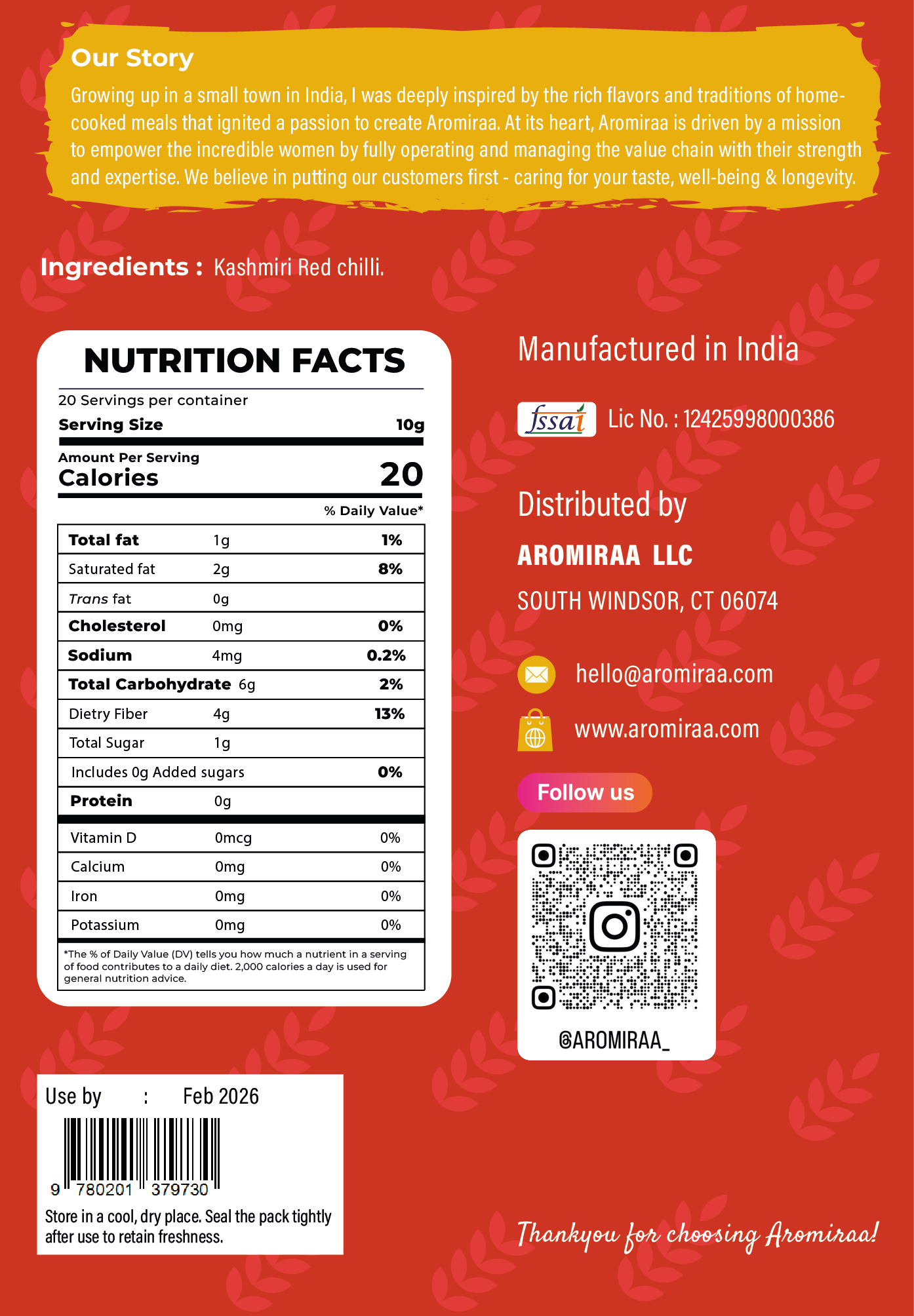 Mild heat, vibrant red color – our Kashmiri chilli powder adds rich flavor and a beautiful hue to your dishes. Perfect for Indian curries, tandoori, and everyday cooking.